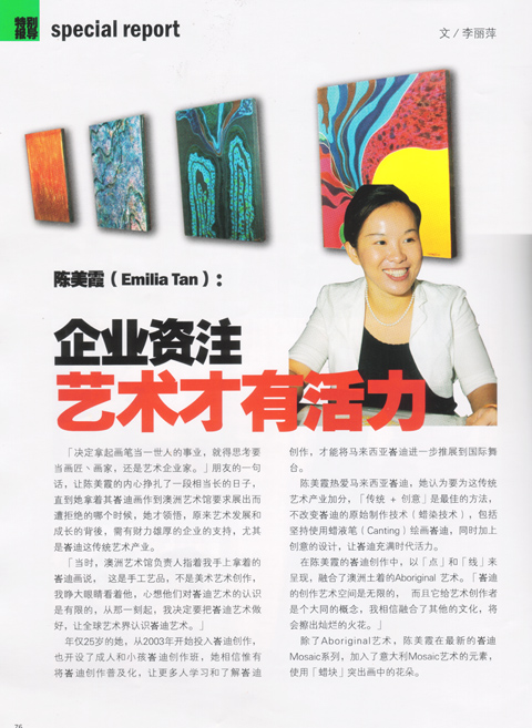 “Emilia Tan, a young Malaysian batik artist, whose work is contemporary and multi-culture, successfully fusing Malaysia batik techniques with influences from Australian Aboriginal Art” by Garden International School ACCESS Magazine, December 2005