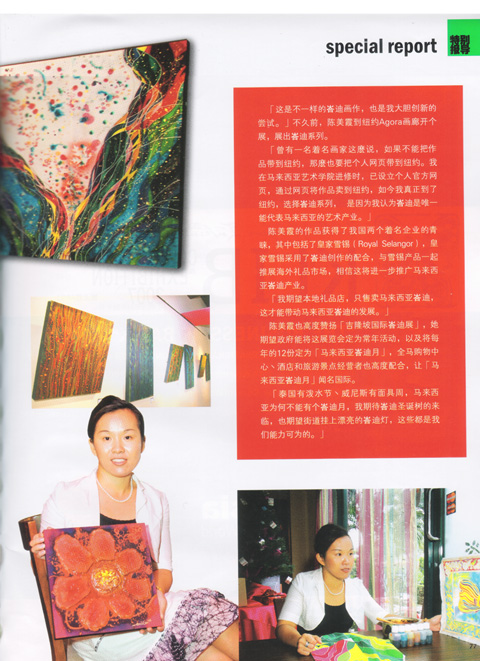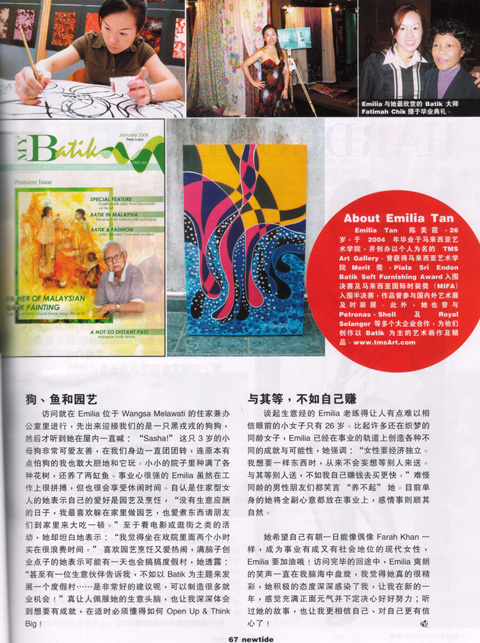 “To find a Chinese lady taking interest in batik painting may be hard, but finding a talented one who is naturally interested in using batik as a medium of fine artistic expressions besides being keen on bringing it to the world stages is nearly impossible. One such lady, though, is Emilia Tan ” by Soka Gakkai Malaysia’s COSMIC Magazine, June 2006